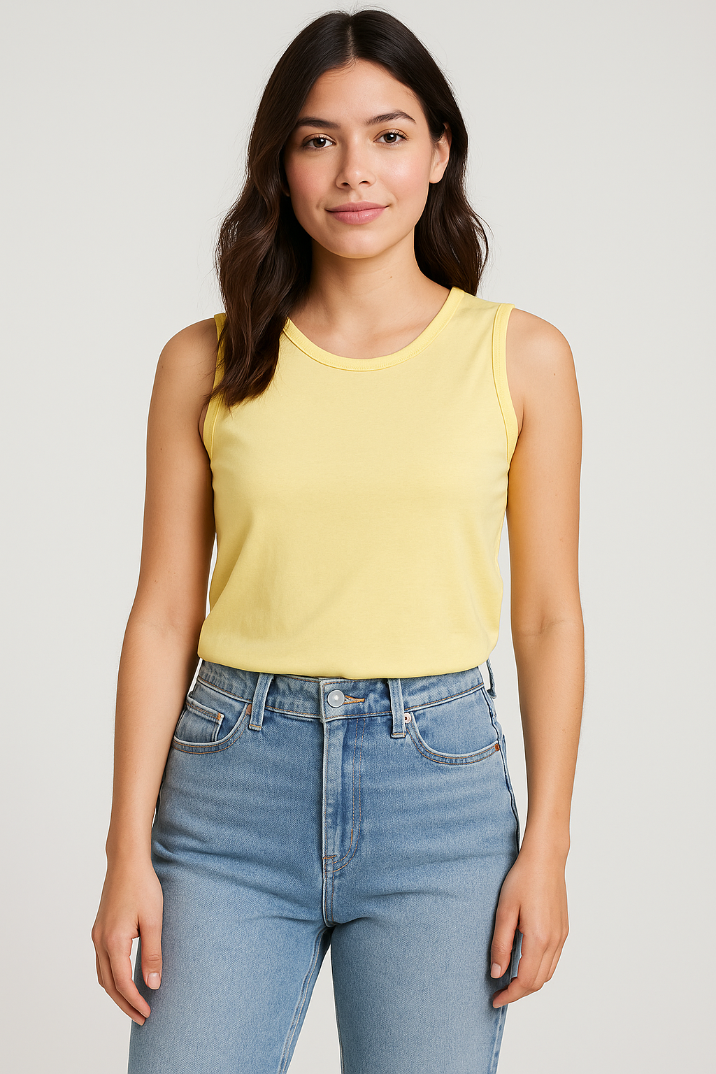 Camiseta de mujer manga cero con cuello redondo, confeccionada en algodón pima peruano 100%. Reconocido por su suavidad excepcional, resistencia y durabilidad, este algodón ofrece una prenda fresca, cómoda y de alta calidad que se mantiene impecable lavado tras lavado.
